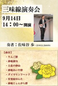三味線で「安里屋ゆんた」「津軽じょんがら節」などの民謡や