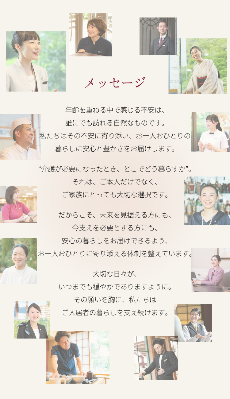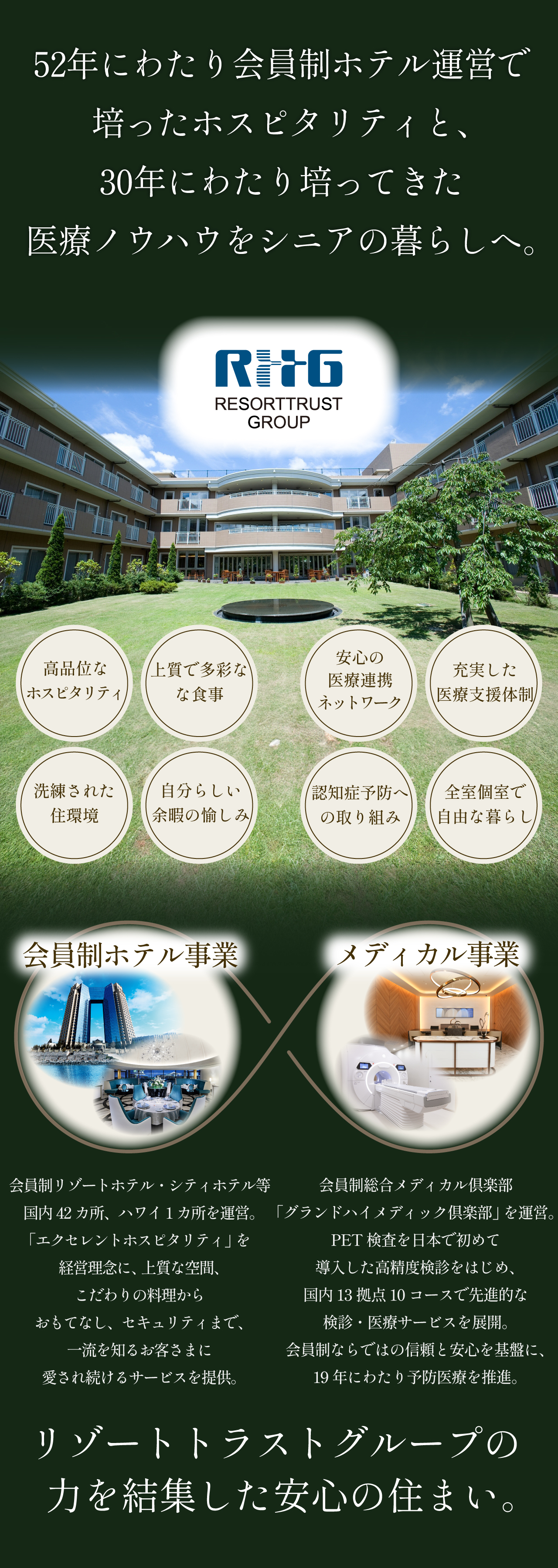 私たちは、リゾートトラスト株式会社のグループ企業が運営するシニアレジデンスです。リゾートトラストグループは、「エクシブ」「ザ・カハラ・ホテル&リゾート」等のホテルの運営をはじめ、クリニックや老人ホーム等、幅広い領域で事業を展開しています。