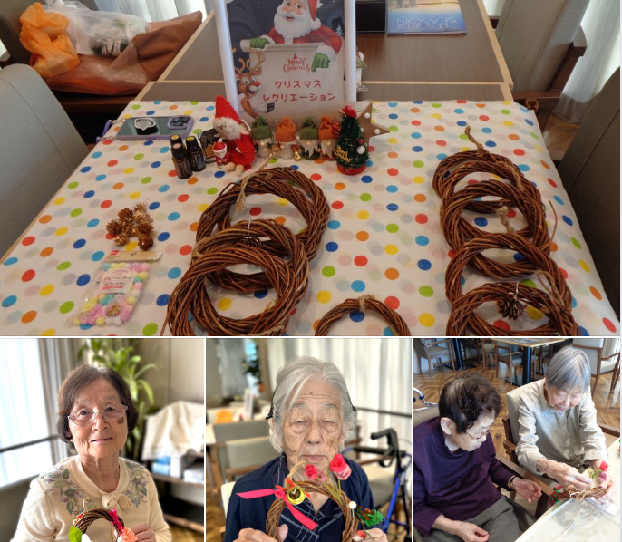 手芸レクでサンタノーム人形作りを実施しました。 同じ素材ですが、「この子は右利きだから杖は右ね」「帽子は右に・・」「眼もつけてあげたい」など、愛着を持って作られていました。