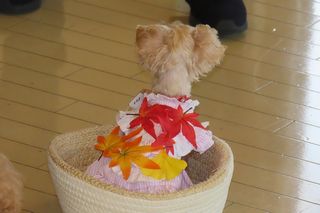 ワンちゃんの服にご入居者が紅葉やイチョウの葉を順番に貼っていくと、、、。
