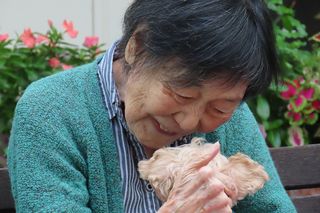 今回はご入居者が「おやつどうぞ~」と呼びかけるとわんちゃんが飛んできます。