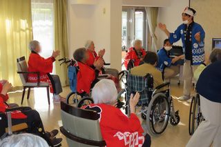 赤や青の半被をまとったご入居者は始めに準備体操をしっかり行い、