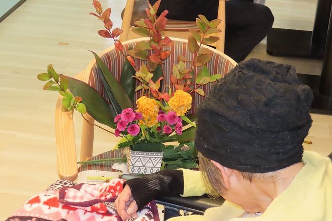 11月23日は園芸療法の日でした。 今回のプログラムは『紅葉のアレンジメント』になります。 まずは「ドラセナ」と「紅葉ヒペリカム」の2種類の葉で周りを囲んで整え、 黄色の「ケイトウ」、赤紫色の「スプレー菊」の2種類の花を […]