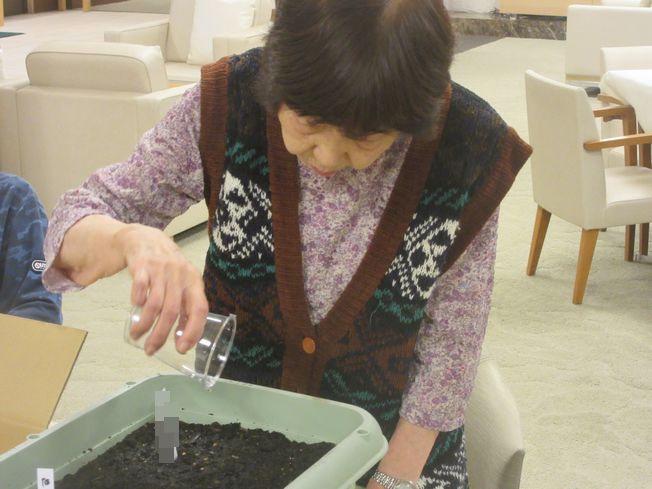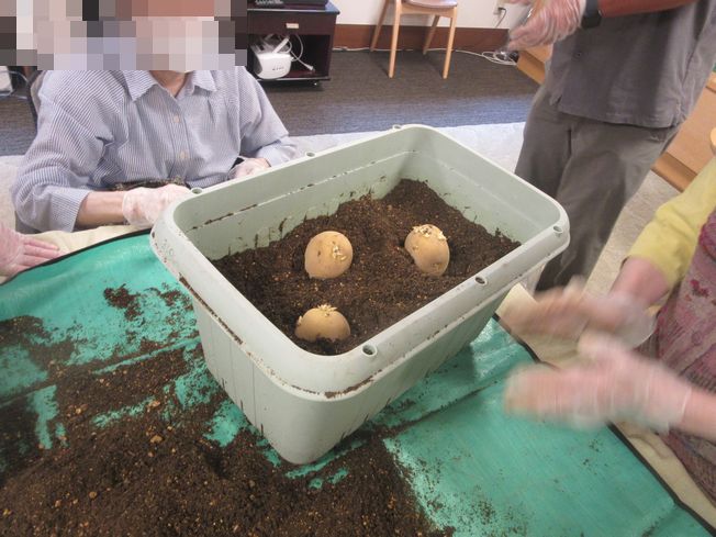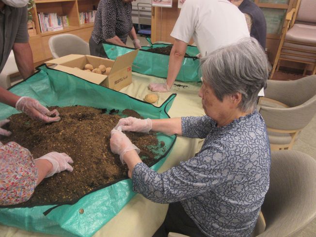 9月の園芸部はジャガイモの植え付けをしました。 土を手でほぐして柔らかくしプランターに入れていきます。 『園芸は好きなのよ』『土を触るのは楽しいわ』とお話しされていました。 美味しいジャガイモの収穫を期待して育てていきます。