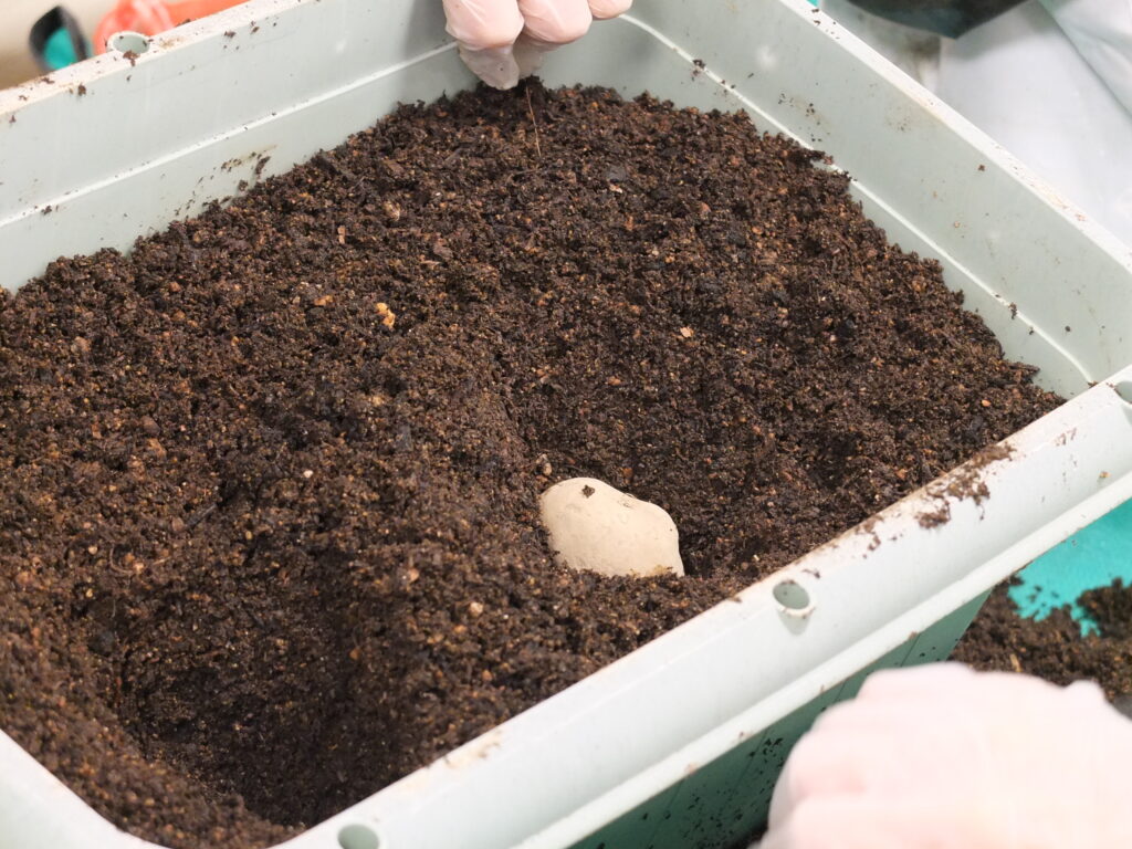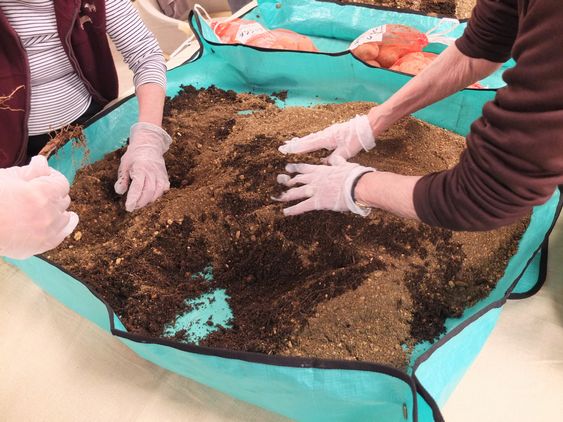 今月の園芸部は、春の収穫に向けて「じゃがいも」の種芋を植え付けました。