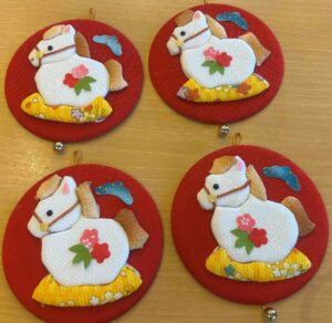 お正月レクの一環としてくるみやすい形と大きさのパーツ6個で作れる押絵づくりを今年も実施しました。昨年の作品(へび)と比べながら楽しくわきあいあいと作成。完成後、皆で作品を見せ合いながらお互いに「かわいいわね」と満足げなご様子でした。